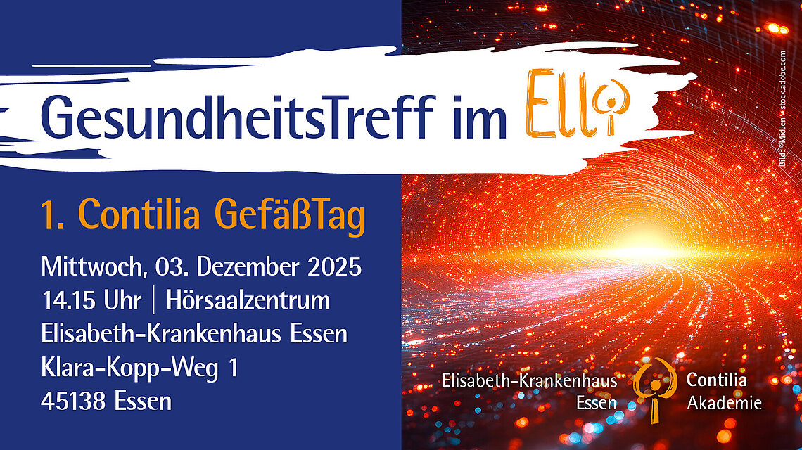 Die Klinik für Gefäßchirurgie und Phlebologie des Elisabeth-Krankenhauses Essen lädt alle Interessierten herzlich für Mittwoch, 3. Dezember, zum 1. Contilia GefäßTag ins Hörsaalzentrum des Elisabeth-Krankenhauses (Klara-Kopp-Weg 1, 45138 Essen) ein. Die Veranstaltung beginnt um 14.15 Uhr.